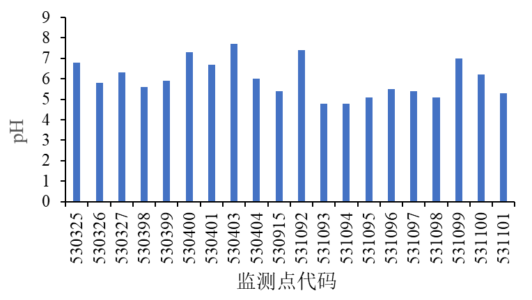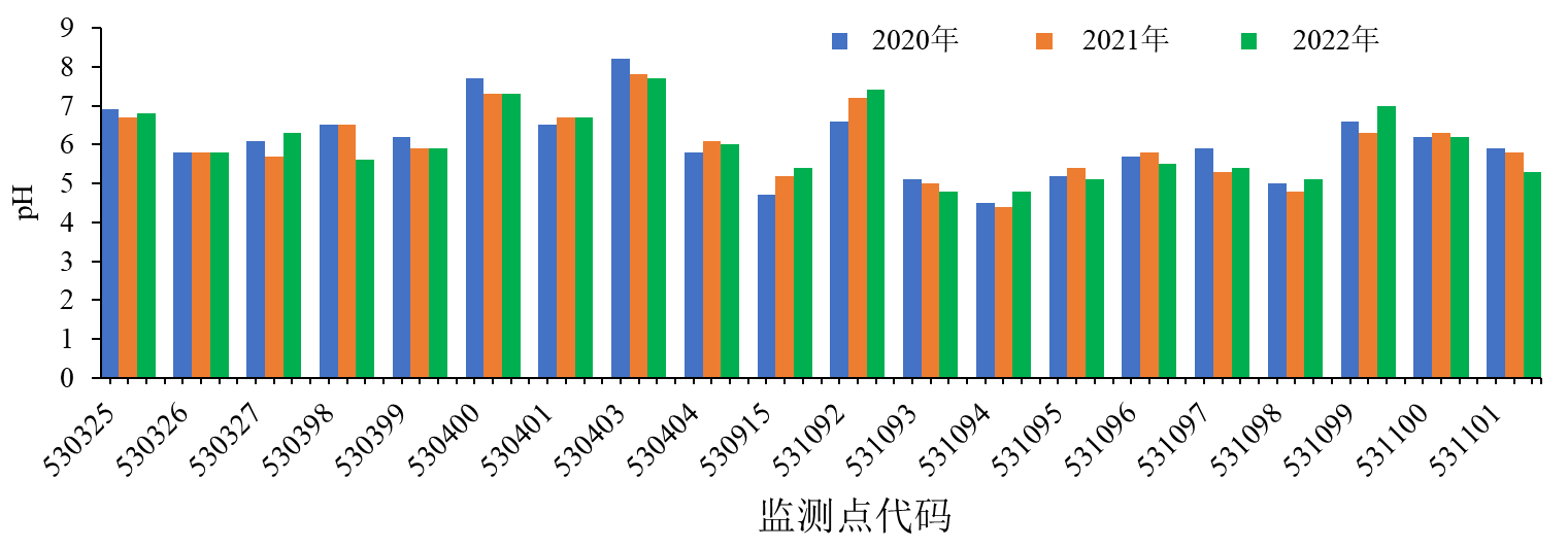 与2020年、2021年相比,2022年监测点土壤pH比较稳定,变化不大(图8)。2020年、2021年和2022年的平均值分别为6.1、6.0和6.0。其中,530401(临翔区博尚永泉)、530404(临翔区博尚永泉)、530915(文山市马塘新开田)、531092(昭阳区太平水塘坝)等4个监测点pH有逐年上升趋势;530398(澜沧县东回东岗)、530403(广南县旧莫乡昔板村)、531093(盐津县牛寨乡敦厚村)、531097(勐海县勐混镇贺开村)、531101(南华县龙川镇罗家屯村)等5个监测点pH则呈逐年下降趋势;其他监测点变化趋势不明显,呈波动变化。