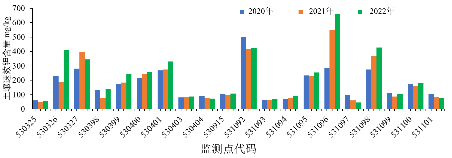 与2020年、2021年相比,2022年土壤速效钾整体比较稳定,变化不大(图13)。2020年、2021年和2022年速效钾平均值分别为177mg/kg、188mg/kg和219.35mg/kg。其中,530326(麒麟区越州)、530401(临翔区博尚永泉)、531096(华宁县青龙镇)、531098(施甸县水长乡)等4个监测点速效钾上升趋势明显;531097(勐海县勐混镇贺开村)和531101(南华县龙川镇)等2个监测点速效钾呈下降趋势。其他监测点速效钾变化幅度较小。