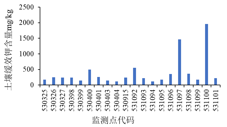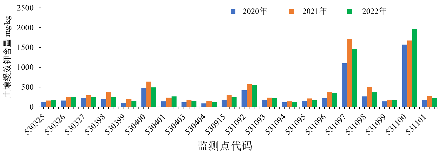 与2021年相比,2022年监测点土壤缓效钾略有下降(图14)。2020年、2021年、2022年平均值分别为309mg/kg、432mg/kg、396mg/kg,2022年比2020年提高了28%,比2021年下降了8%。其中,530326(临翔区博尚讯房)、530399(思茅区南屏镇整碗村)、530401(临翔区博尚永泉)、531096(华宁县青龙镇大村)、531098(施甸县水长乡小官市村)等监测点的缓效钾含量上升较快。531097(勐海县勐混镇贺开村)和531100(芒市遮放镇户弄村)缓效钾平均达到了1469mg/kg和1964mg/kg。