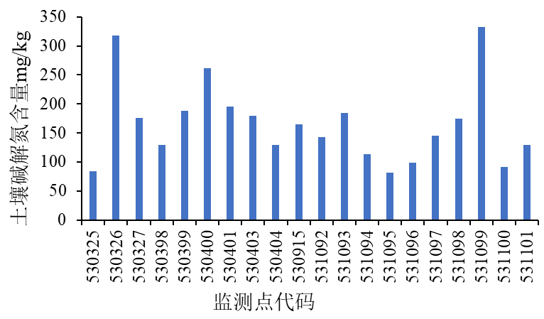 图4 2022年各监测点常规施肥区土壤碱解氮含量情况