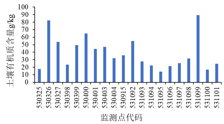 土壤有机质含量在17.00g/kg~89.10g/kg(图2),区域之间、不同土壤类型之间差异巨大。中、南部地区含量普遍偏低,北部的温凉区相对较高。可能原因是中、南部气温较高,田间耕作水平高且较少施用有机肥,有机质积累少;而北部气温偏低,大多一年一季,田间耕作水平较低,有利于有机质积累。典型值为海拔2200米左右的531099(鹤庆县)水稻土监测点,有机质含量达89.10g/kg水平;而海拔790米的531100(芒市)稻-玉(烟)-菜轮作地监测点有机质含量仅17.0g/kg。红壤、赤红壤、黄壤、水稻土有机质平均值分别为37.61g/kg、20.80g/kg、41.30g/kg、45.40g/kg,从监测结果看总体有机质含量为中上水平,且比较稳定。