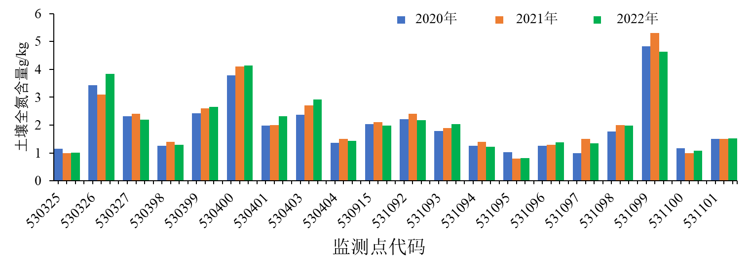 与2020年、2021年相比,2022年监测点全氮总体比较稳定,变化幅度较小(图10)。其中,2020年、2021年和2022年土壤全氮的平均值分别为2.0g/kg、2.10g/kg和2.10g/kg。其中,531095(红塔区高仓街道龙树村)监测点全氮呈下降趋势;530399(思茅区南屏镇整碗村)、530403(广南县旧莫乡昔板村)、531093(盐津县牛寨乡敦厚村)、531096(华宁县青龙镇大村)、531098(施甸县水长乡小官市村)监测点全氮呈上升趋势;其他监测点无明显变化趋势,呈波动变化。