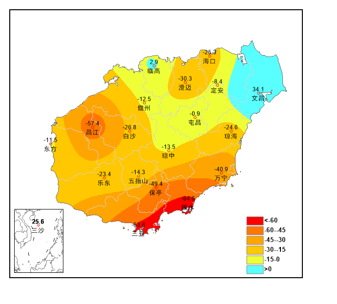 图22023年1月1日~2月28日海南省各地降水量距平百分率分布图(%)