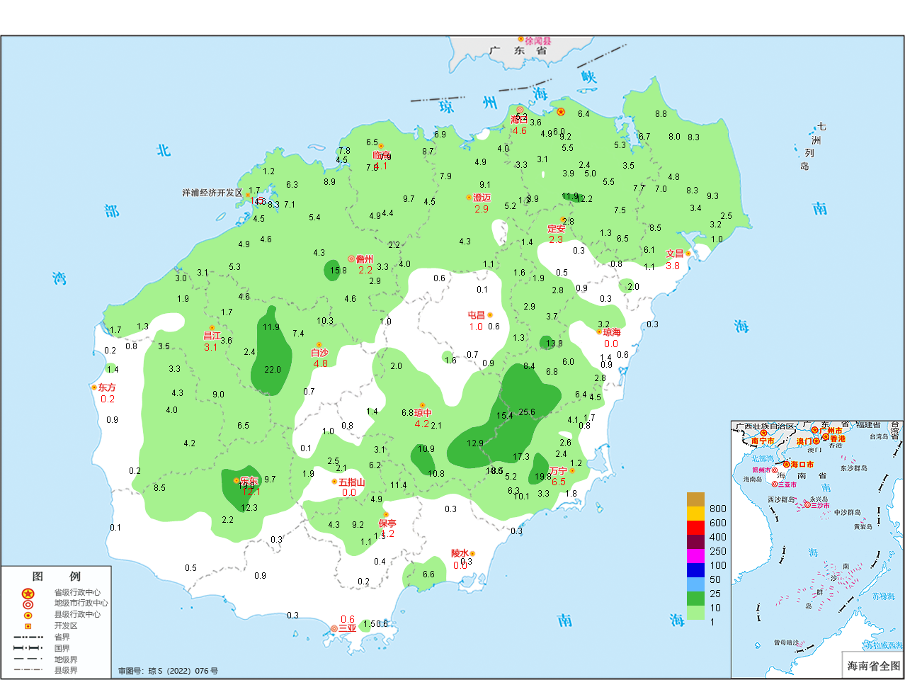 据统计,2月3日08时~10日08时,琼海、白沙、万宁、乐东、儋州、琼中、定安、海口和保亭9个市县共20个乡镇(区)雨量超过10毫米,最大为琼海市会山镇25.6毫米(见附图)。