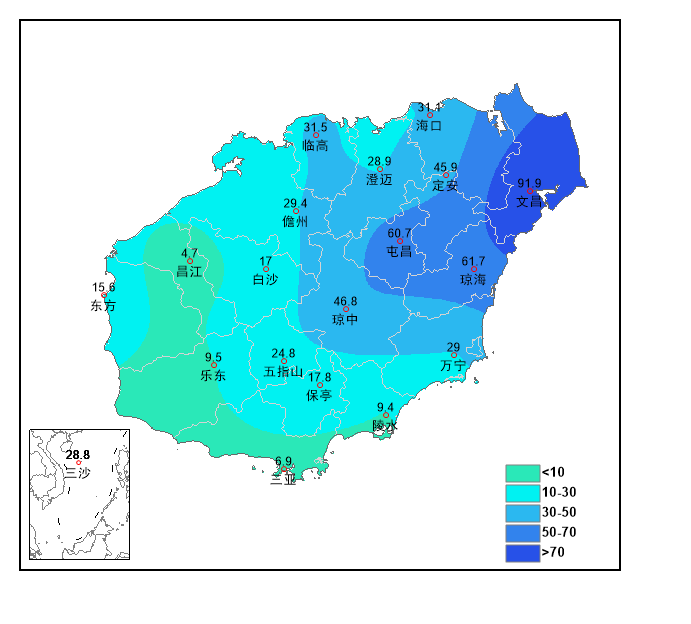 2023年1月1日~1月31日,全省平均降雨量31.1毫米,较常年同期偏多9.6毫米(44.7%)。各地降雨量4.7(昌江)~91.9毫米(文昌),与常年同期相比,陵水、万宁、昌江和乐东偏少10.4~41.6%,其余市县偏多9.0~152.5%,详见图1、图2。