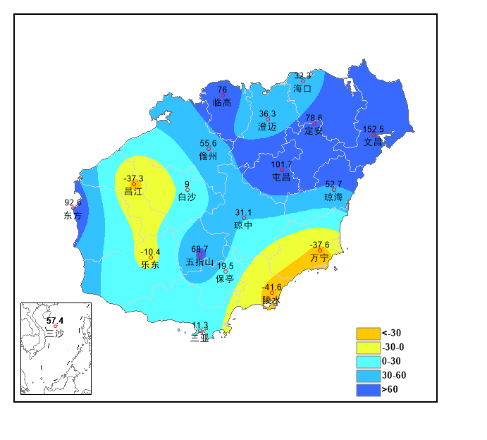 2023年2月,我省各地降雨量较常年偏多10~20%,其中海南岛北部地区累积雨量20~45毫米,东部地区45~60毫米,中部地区15~45毫米,西部地区15~25毫米,南部地区10~30毫米,西沙、南沙群岛10~45毫米。