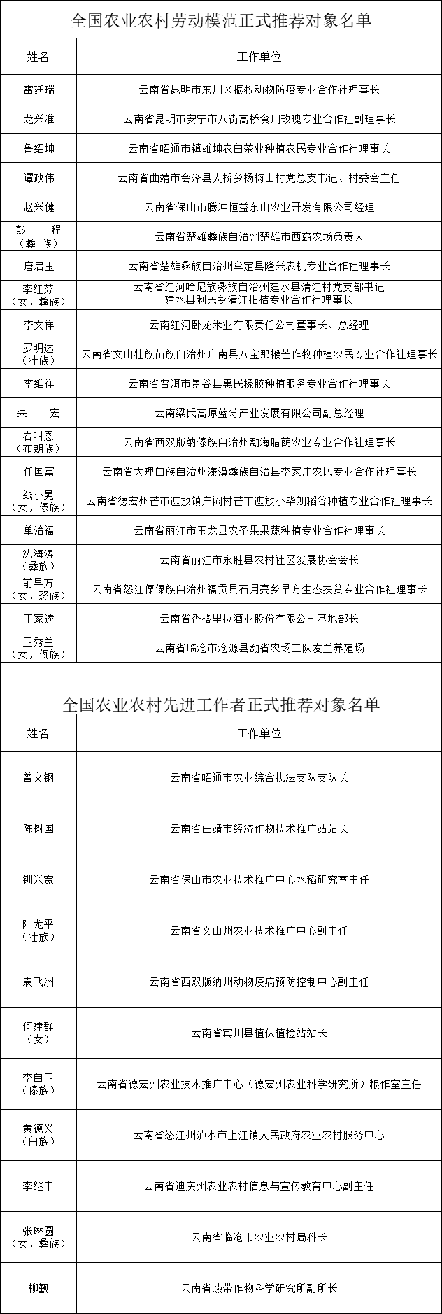 云南省农业农村厅 云南省人力资源和社会保障厅关于全国农业农村劳动模范和先进工作者推荐人选的公示