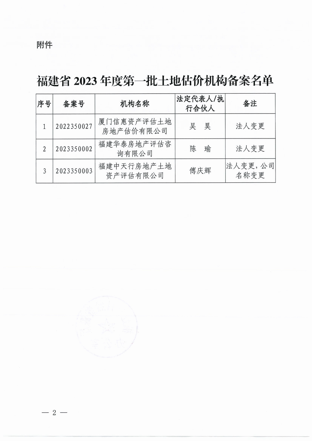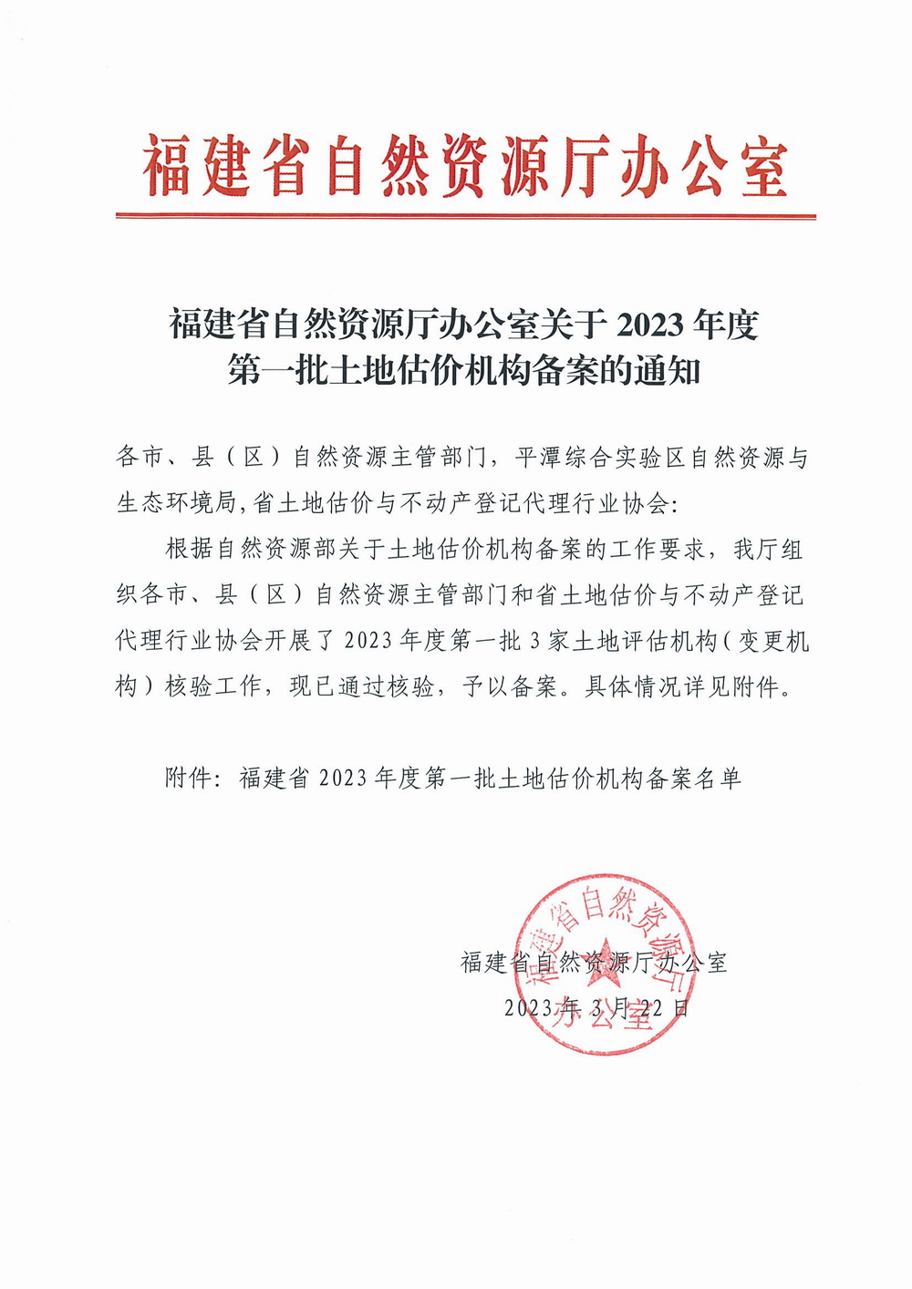 福建省自然资源厅办公室关于2023年度第一批土地估价机构备案的通知