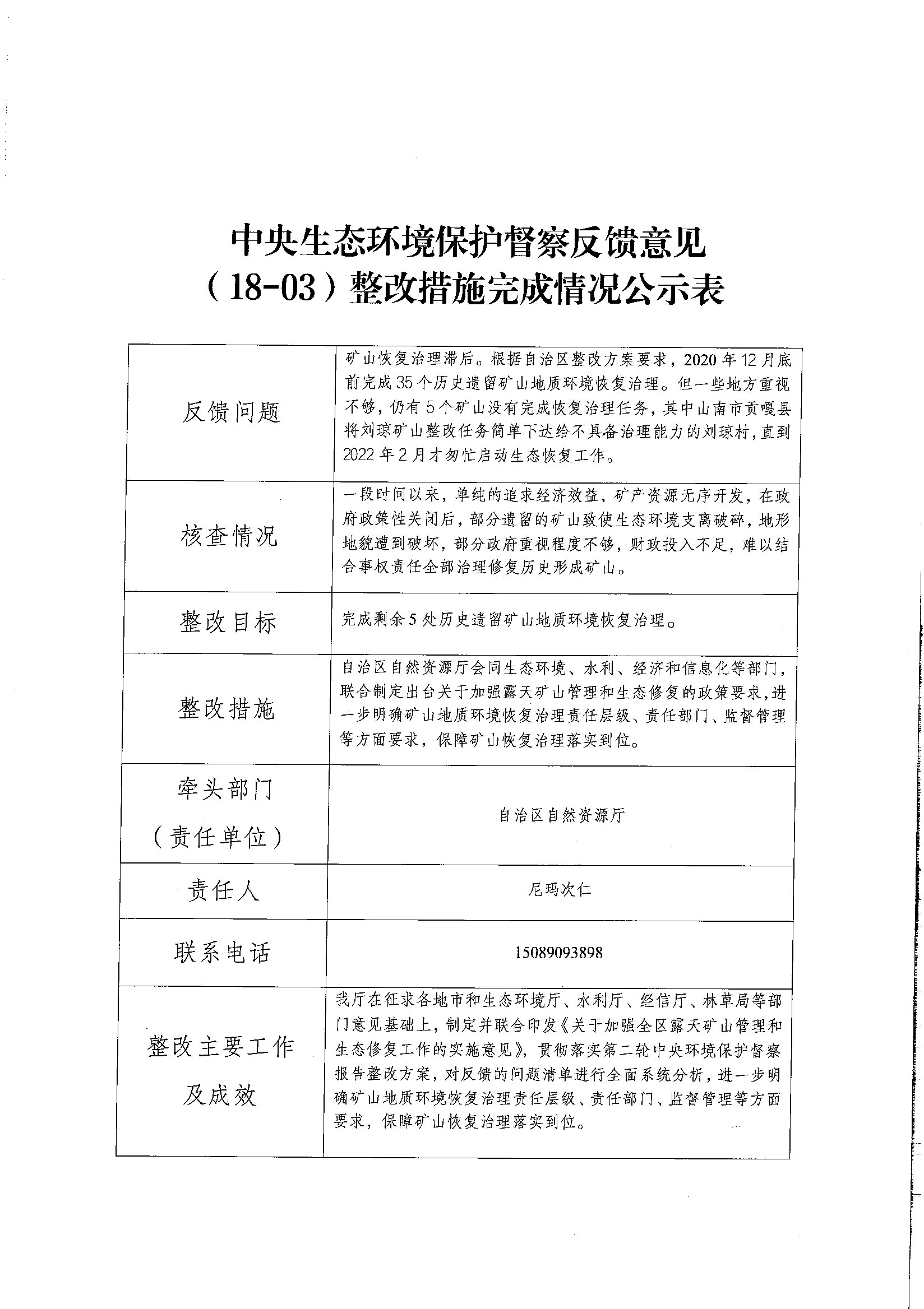 中央生态环境保护督察反馈意见(18-03)整改措施完成情况公示表