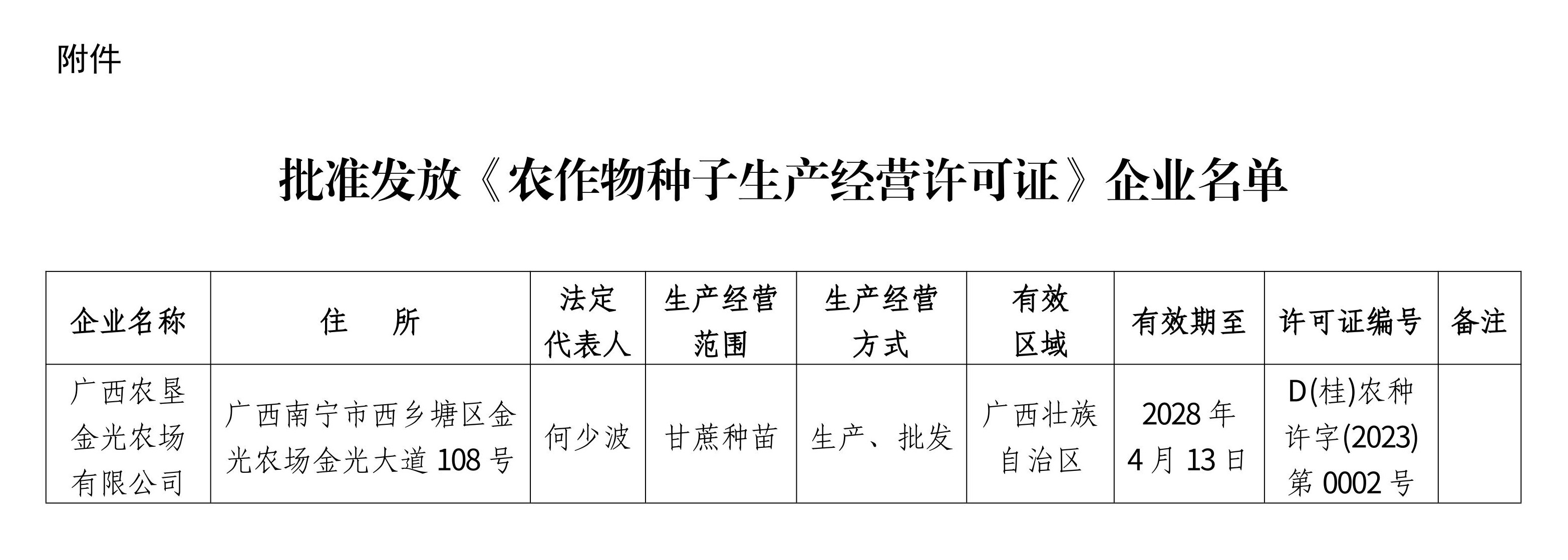 依据《中华人民共和国种子法》《农作物种子生产经营许可管理办法》等有关规定,批准发放广西农垦金光农场有限公司《农作物种子生产经营许可证》(详见附件),现予公告。