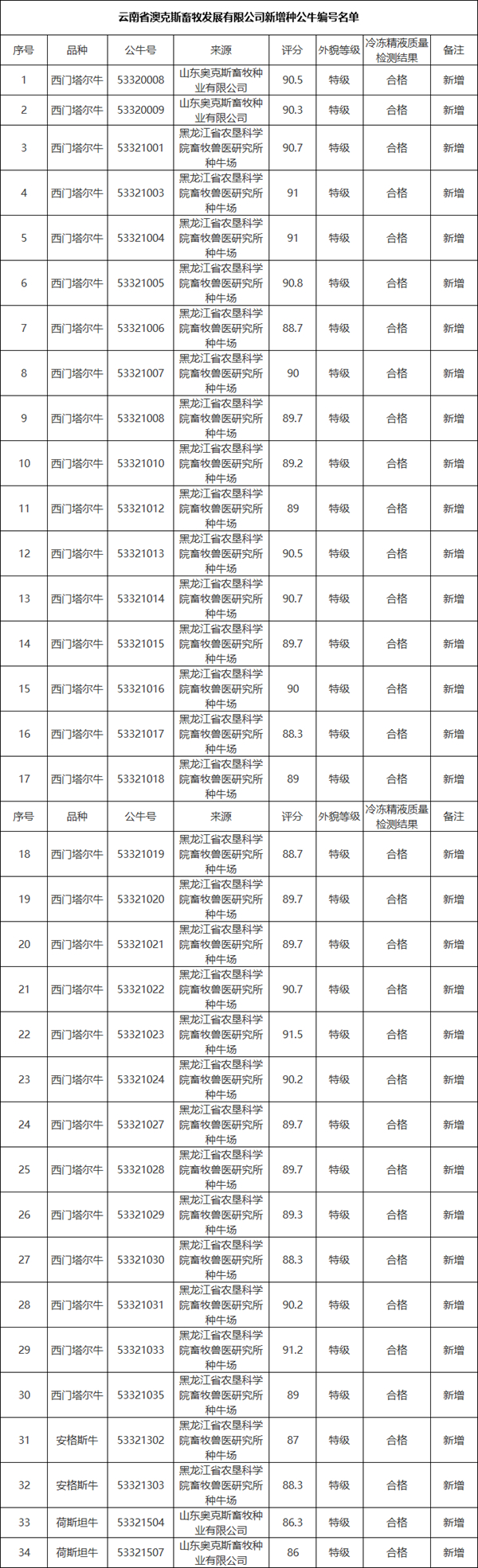 附件:云南澳克斯畜牧发展有限公司新增种公牛编号名单