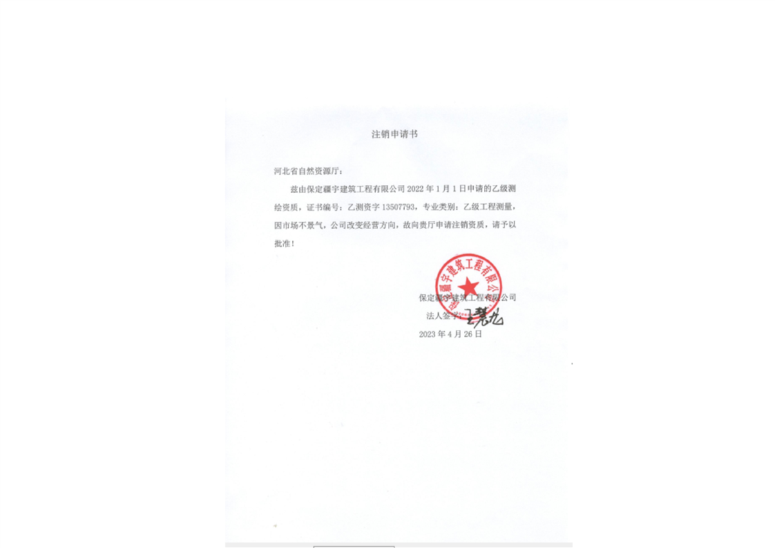 保定疆宇建筑工程有限公司申请测绘资质注销主要信息