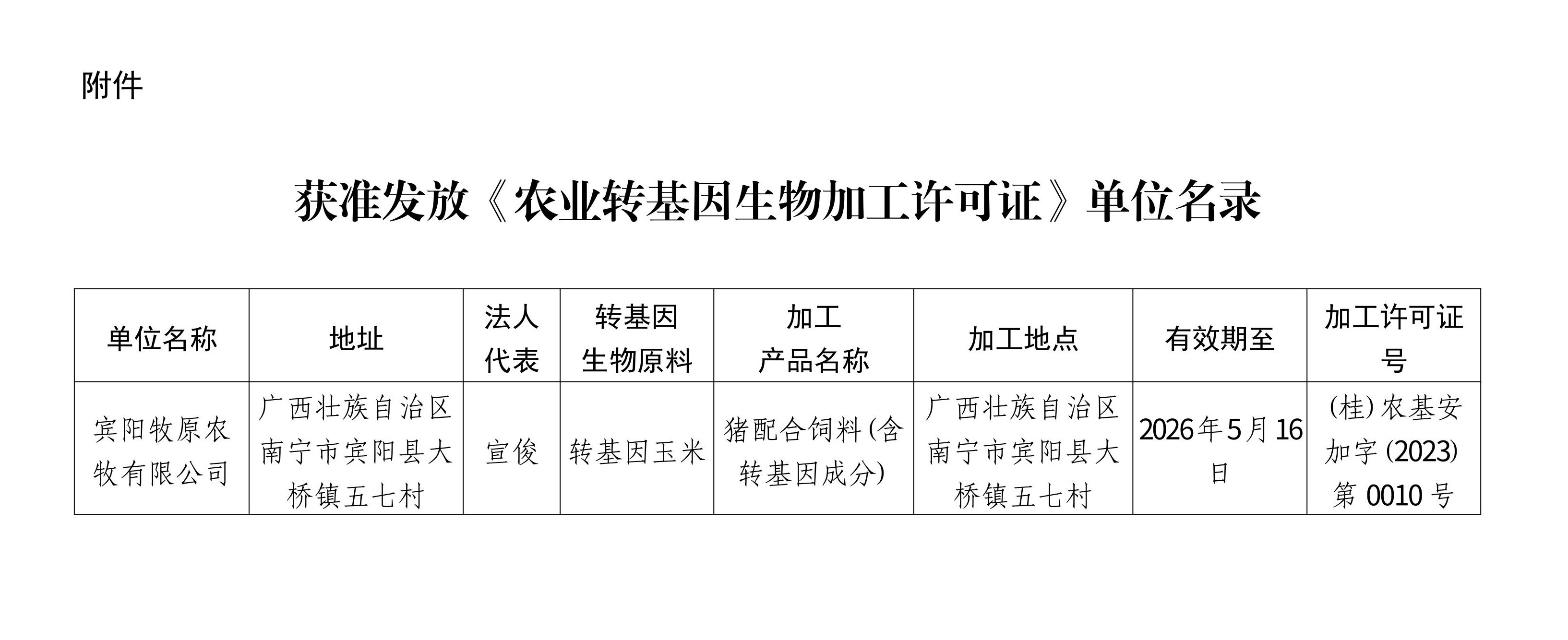 宾阳牧原农牧有限公司于2023年4月4日向我厅申请办理《农业转基因生物加工许可证》。依据《农业转基因生物安全管理条例》和《农业转基因生物加工审批办法》有关规定,我厅对上述企业申请农业转基因生物加工许可的材料进行了审核,并组织专家小组到现场实地考察。根据审核和考察结果,决定发放宾阳牧原农牧有限公司《农业转基因生物加工许可证》,现予公告。