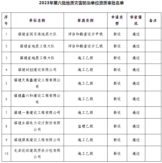 根据《地质灾害防治条例》(国务院令第394号)、《地质灾害防治单位资质管理办法》(自然资源部令第8号)、《自然资源部关于〈地质灾害防治单位资质管理办法〉有关事项的公告》(2022年第97号)、《自然资源部办公厅关于贯彻落实〈地质灾害防治单位资质管理办法〉的通知》(自然资办函〔2022〕2512号)和《福建省自然资源厅关于做好地质灾害防治单位资质审批工作的通知》(闽自然资发〔2022〕82号)等有关规定,我厅组织开展2023年第六批地质灾害防治单位资质申请受理审查工作。经审查并公示,共对9个地质灾害防治单位提交的1个甲级,9个乙级资质申请予以通过,现予公告。