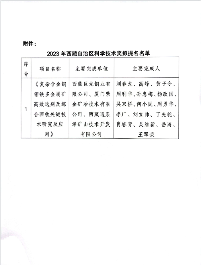 关于拟提名《复杂含金铜钼铁多金属矿高效选别及综合回收关键技术研究及应用》项目申报 2023年西藏自治区科学技术奖的公示