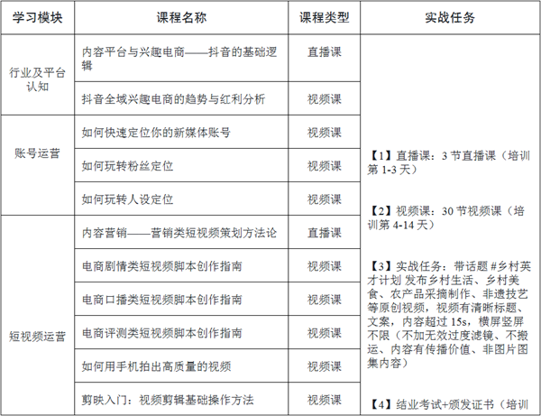 为落实好云南省党政代表团赴浙江省学习考察精神,助力云南脱贫人口和监测对象中返乡大学生、退役军人、返乡务工人员就业创业,充分发挥农村电子商务新业态在缓解返乡大学生、退役军人、返乡务工人员就业创业、助力脱贫人口和监测持续增收和乡村振兴的作用,经研究,拟联合抖音公益,抖音数字学堂,组织开展乡村英才计划云南乡村振兴“电商达人”培训,通过对农业企业和返乡大学生、致富带头人、退役军人、返乡务工人员等培训,搭建起返乡大学生、致富带头人、退役军人和返乡务工人员与农业企业沟通合作的桥梁,助力脱贫人口和监测对象中返乡大学生、退役军人、返乡务工人员通过电商新业态创业就业,带动脱贫人口和监测对象持续增收。现将有关事项通知如下: