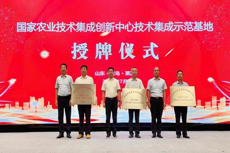 在会上,对山东省青岛市农业技术推广中心、威海市农业农村事务服务中心、平原县农业农村局分别创建的黄淮北部粮油高效节水增产技术集成示范基地、渤海湾产区苹果轻简高效生产技术集成示范基地、黄淮海小麦玉米“吨半粮”技术集成示范基地,分别颁授了“国家农业技术集成创新中心示范基地”铜牌。截至目前,这是全国已评定授牌的仅有的4个国家级基地中的3个。