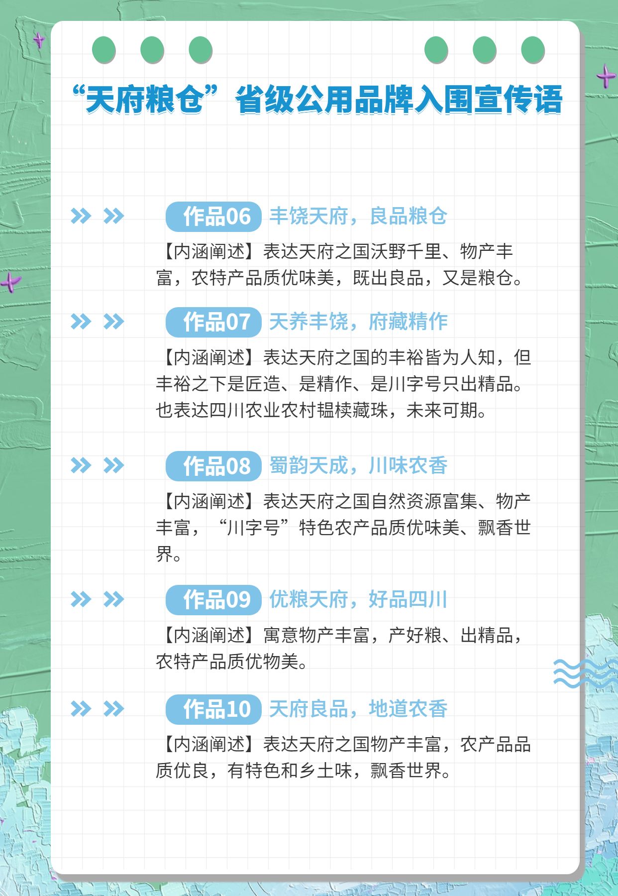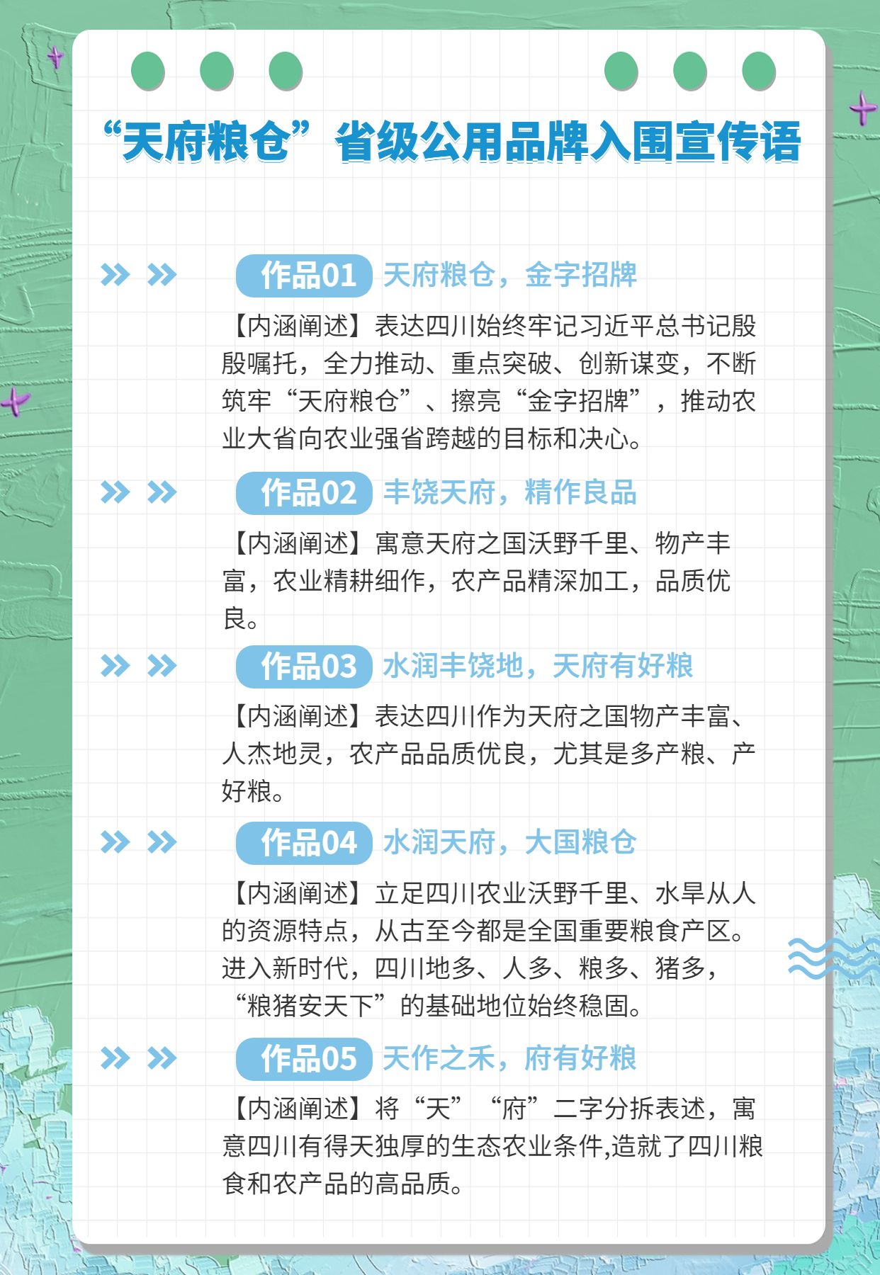 “天府粮仓”省级公用品牌宣传语全球征集活动自2023年5月开展以来,累计征集作品2183份。近期,四川省农业农村厅组织专家对征集作品进行了评审,最终评选出10份入围作品,现予以公示。
