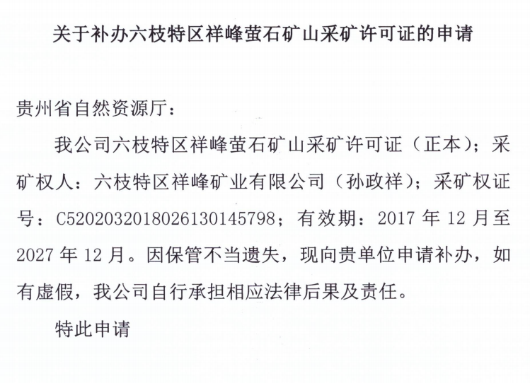 六枝特区祥峰矿业有限公司六枝特区祥峰萤石矿山采矿权,采矿许可证号:C5202032018026130145798,发证机关为贵州省自然资源厅。采矿权人六枝特区祥峰矿业有限公司(孙政祥)将该采矿许可证不慎遗失,现向我厅申请遗失补领(补领申请见附件)。