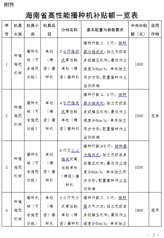 海南省农业农村厅关于 海南省高性能播种机补贴额一览表的通告
