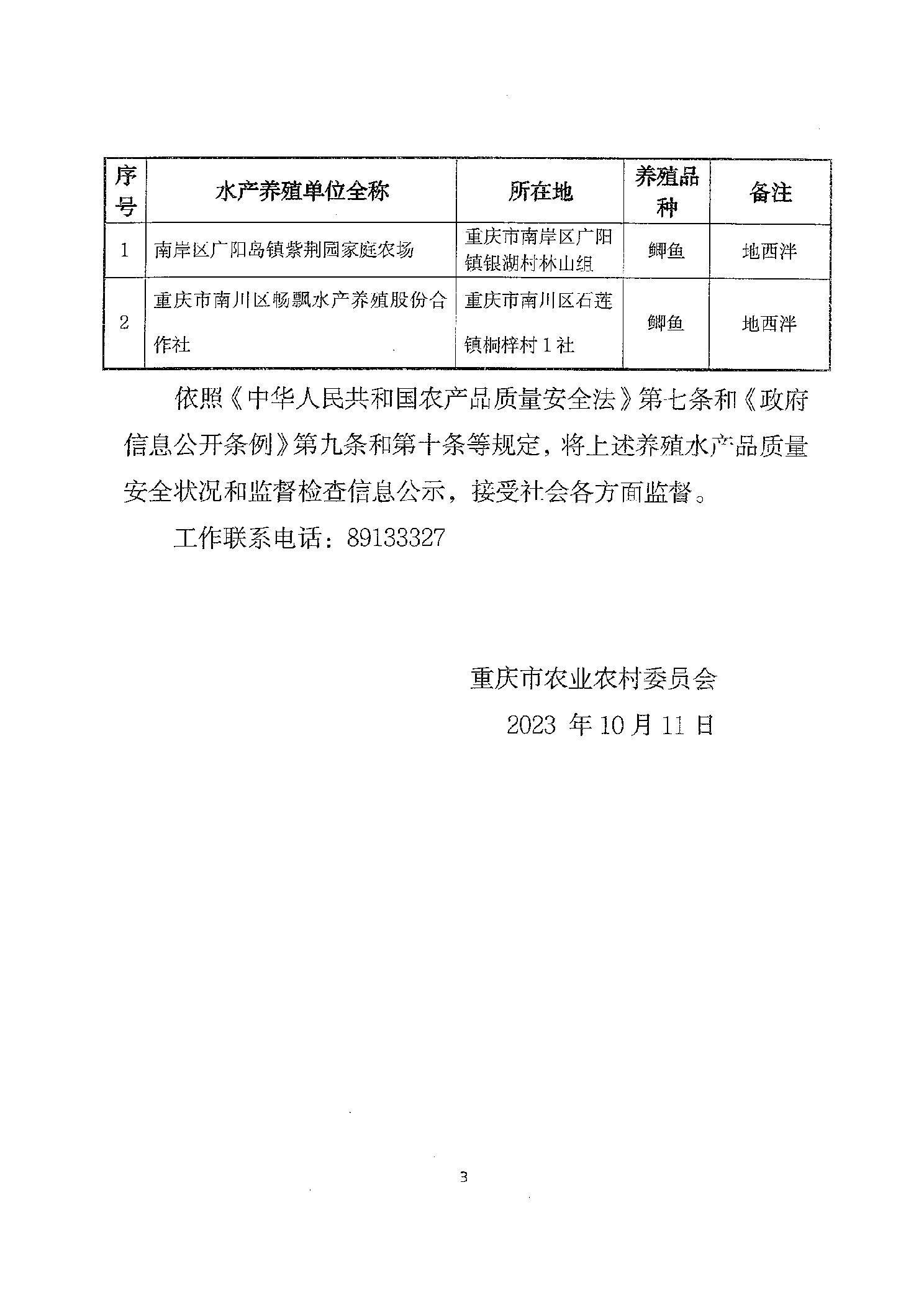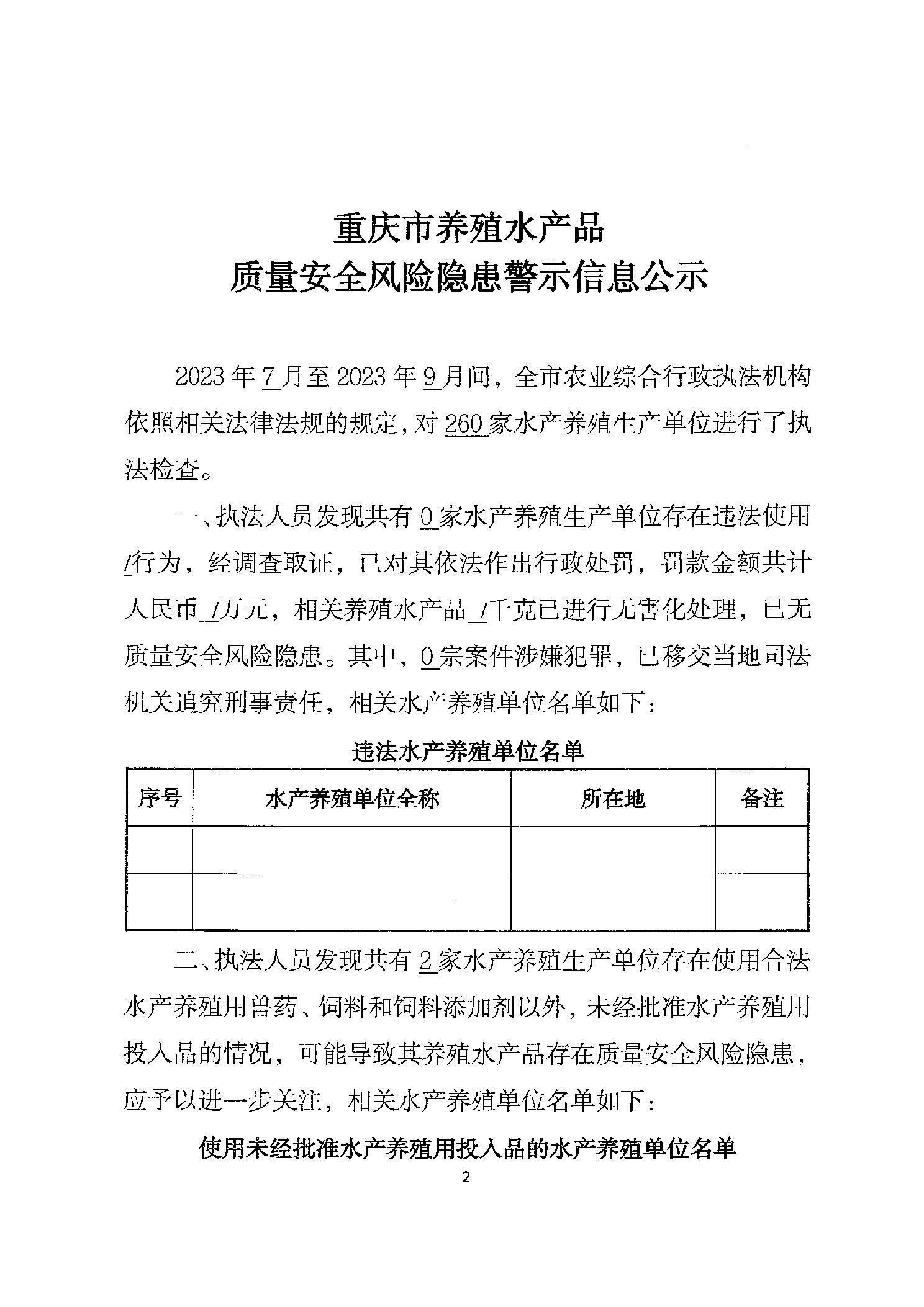 重庆市养殖水产品质量安全风险隐患警示信息公示