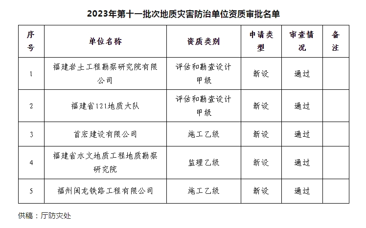 根据《地质灾害防治条例》(国务院令第394号)、《地质灾害防治单位资质管理办法》(自然资源部令第8号)、《自然资源部关于〈地质灾害防治单位资质管理办法〉有关事项的公告》(2022年第97号)、《自然资源部办公厅关于贯彻落实〈地质灾害防治单位资质管理办法〉的通知》(自然资办函〔2022〕2512号)和《福建省自然资源厅关于做好地质灾害防治单位资质审批工作的通知》(闽自然资发〔2022〕82号)等有关规定,我厅组织开展2023年第十一批地质灾害防治单位资质申请受理审查工作。经审查并公示,共对5个地质灾害防治单位提交的2个甲级、3个乙级资质申请予以通过,现予公告。