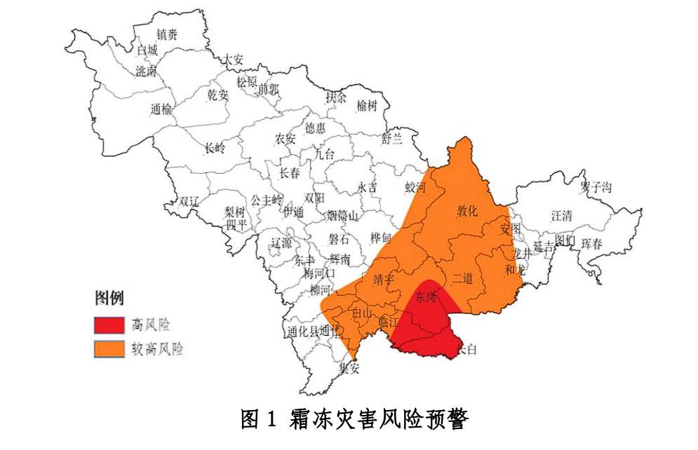 目前,我省主要粮食作物已经成熟并开始收获,此次霜冻过程将对设施农业及秋菜产生不利影响。预计 5-7 日,吉林东部、延边西部、通化北部、白山大部发生霜冻害风险较高,长白山保护区发生霜冻害风险高(图 1)。