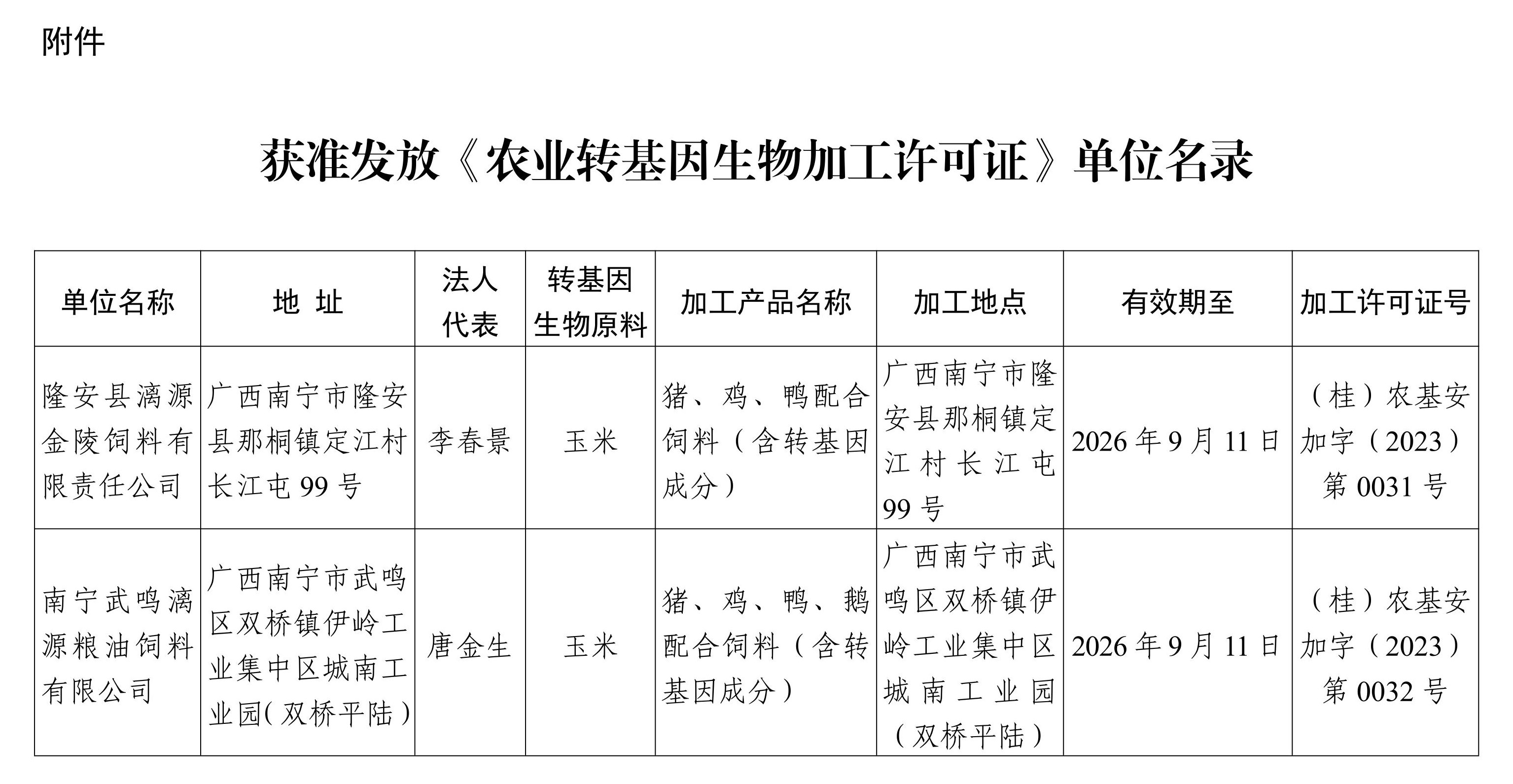 隆安县漓源金陵饲料有限责任公司、南宁武鸣漓源粮油饲料有限公司分别于2023年8月11日、8月15日向我厅申请办理《农业转基因生物加工许可证》。依据《农业转基因生物安全管理条例》和《农业转基因生物加工审批办法》有关规定,我厅对上述企业申请农业转基因生物加工许可的材料进行了审核,并组织专家小组到现场实地考察。根据审核和考察结果,决定发放隆安县漓源金陵饲料有限责任公司与南宁武鸣漓源粮油饲料有限公司《农业转基因生物加工许可证》,现予公告。