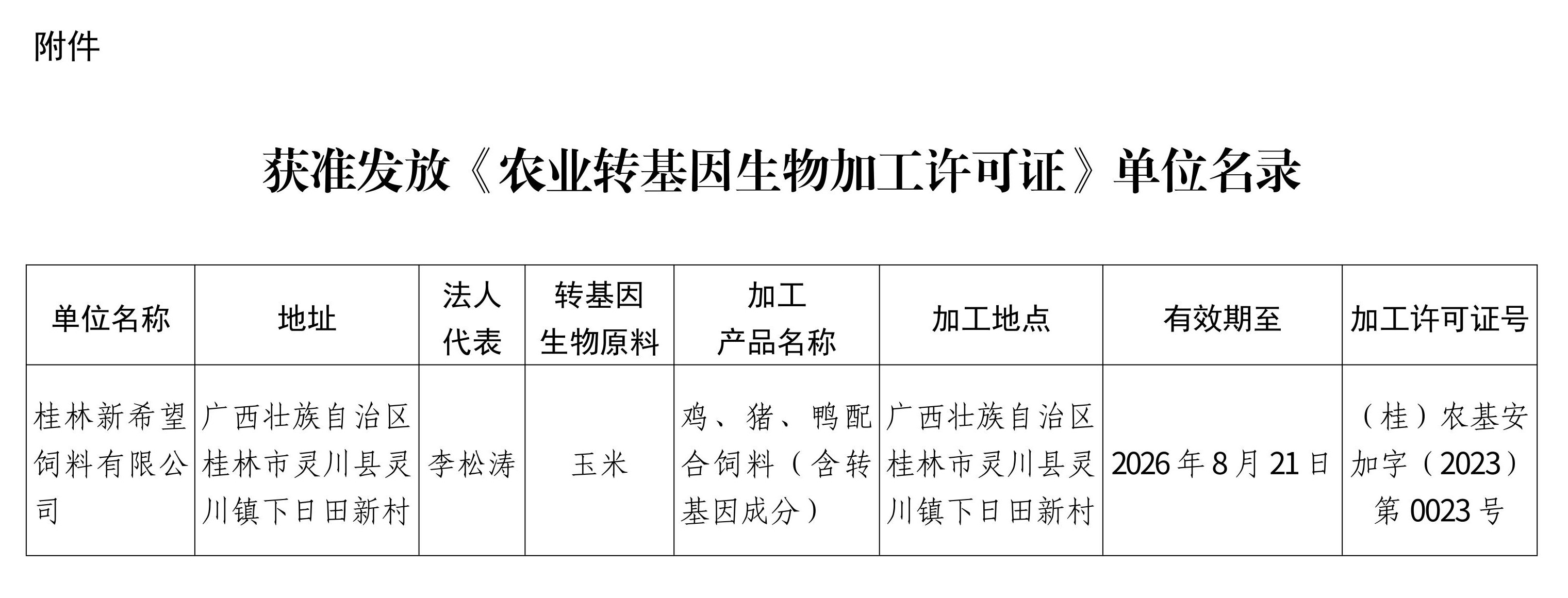 桂林新希望饲料有限公司于2023年8月2日向我厅申请办理《农业转基因生物加工许可证》。依据《农业转基因生物安全管理条例》和《农业转基因生物加工审批办法》有关规定,我厅对上述企业申请农业转基因生物加工许可的材料进行了审核,并组织专家小组到现场实地考察。根据审核和考察结果,决定发放桂林新希望饲料有限公司《农业转基因生物加工许可证》,现予公告。