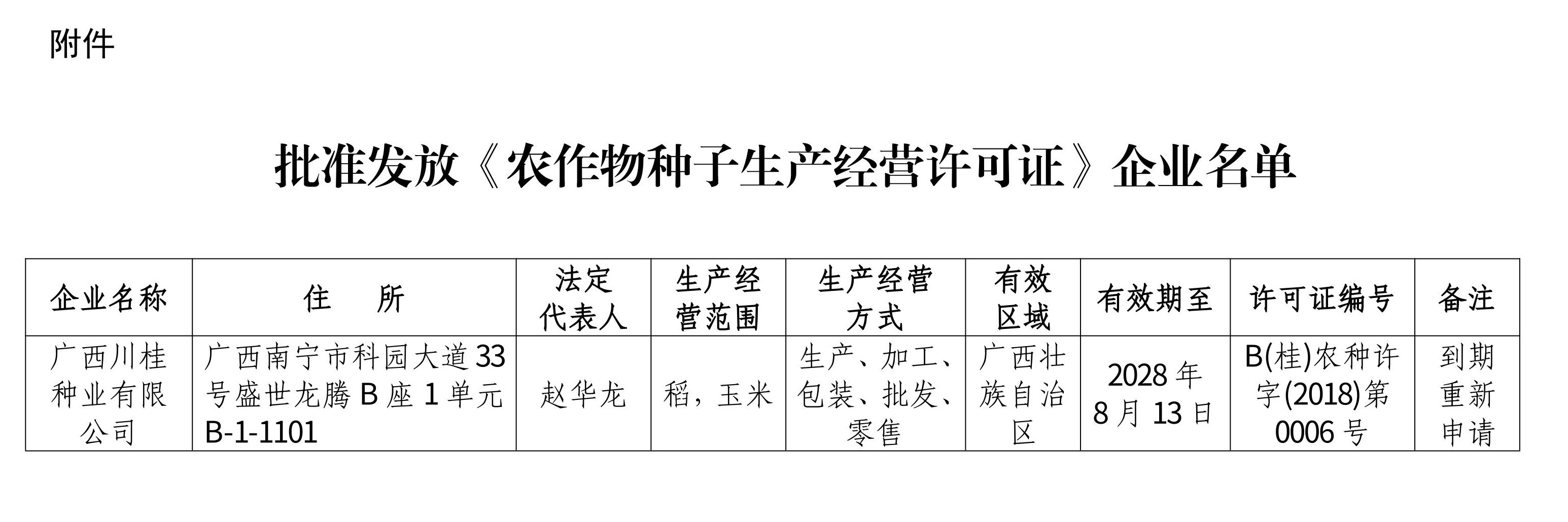 依据《中华人民共和国种子法》《农作物种子生产经营许可管理办法》等有关规定,批准发放广西川桂种业有限公司《农作物种子生产经营许可证》(详见附件),现予公告。