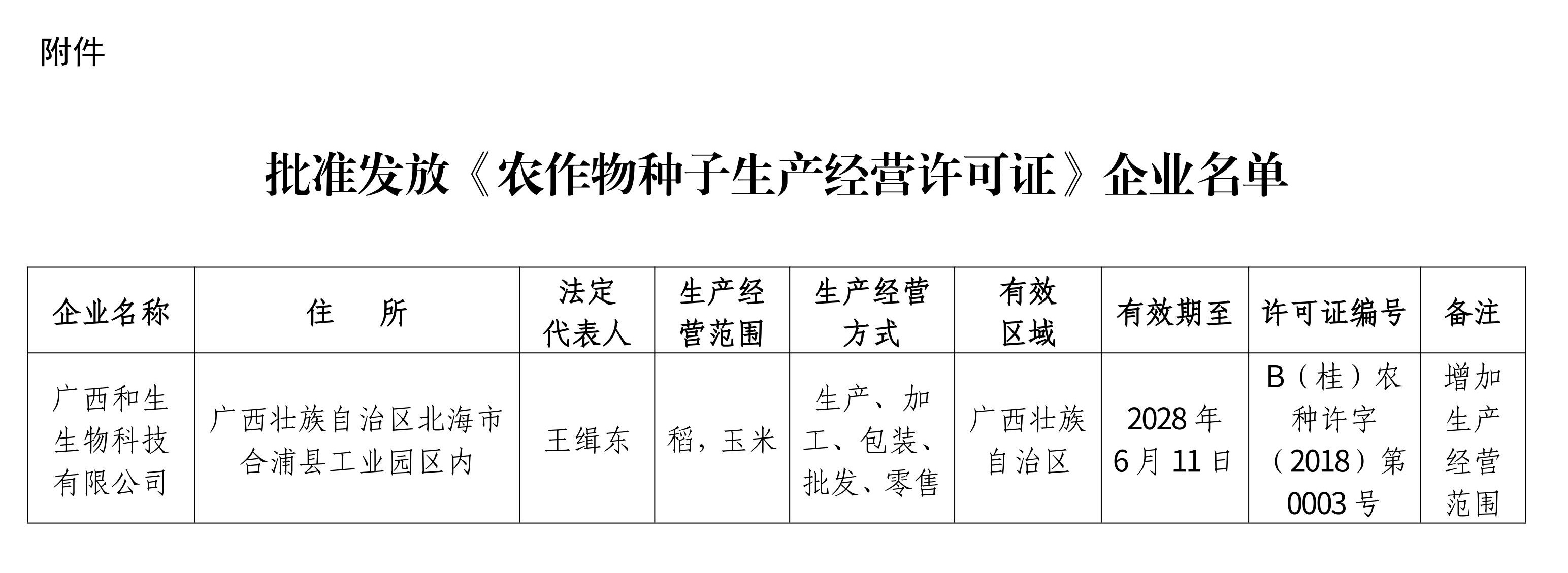 依据《中华人民共和国种子法》《农作物种子生产经营许可管理办法》等有关规定,批准发放广西和生生物科技有限公司《农作物种子生产经营许可证》(详见附件),现予公告。