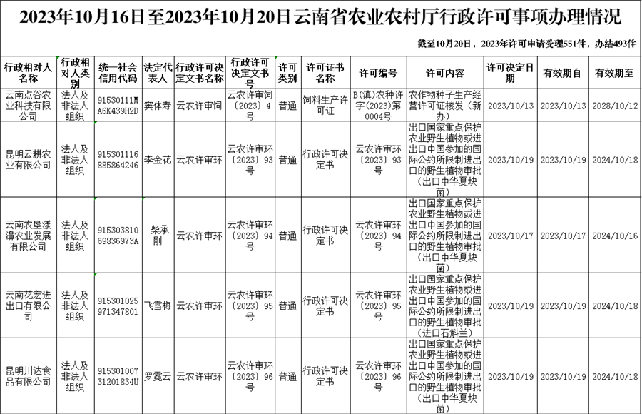 2023年10月16日至2023年10月20日云南省农业农村厅行政许可事项办理情况