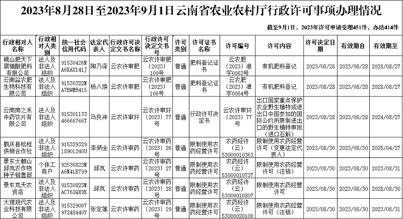 2023年8月28日至2023年9月1日云南省农业农村厅行政许可事项办理情况