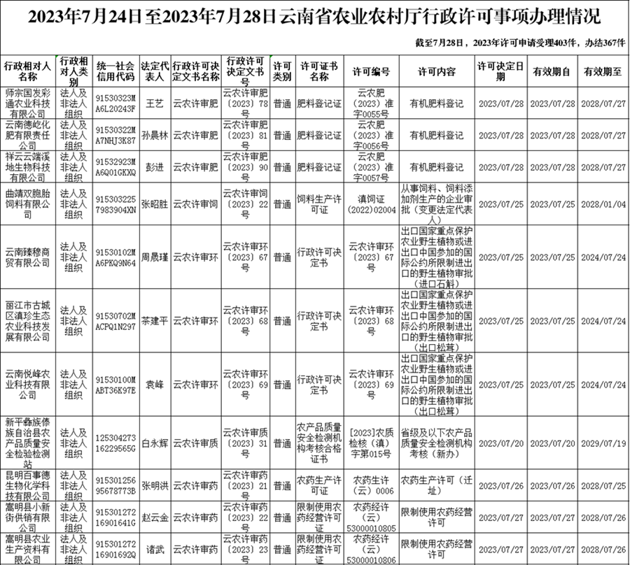 2023年7月24日至2023年7月28日云南省农业农村厅行政许可事项办理情况