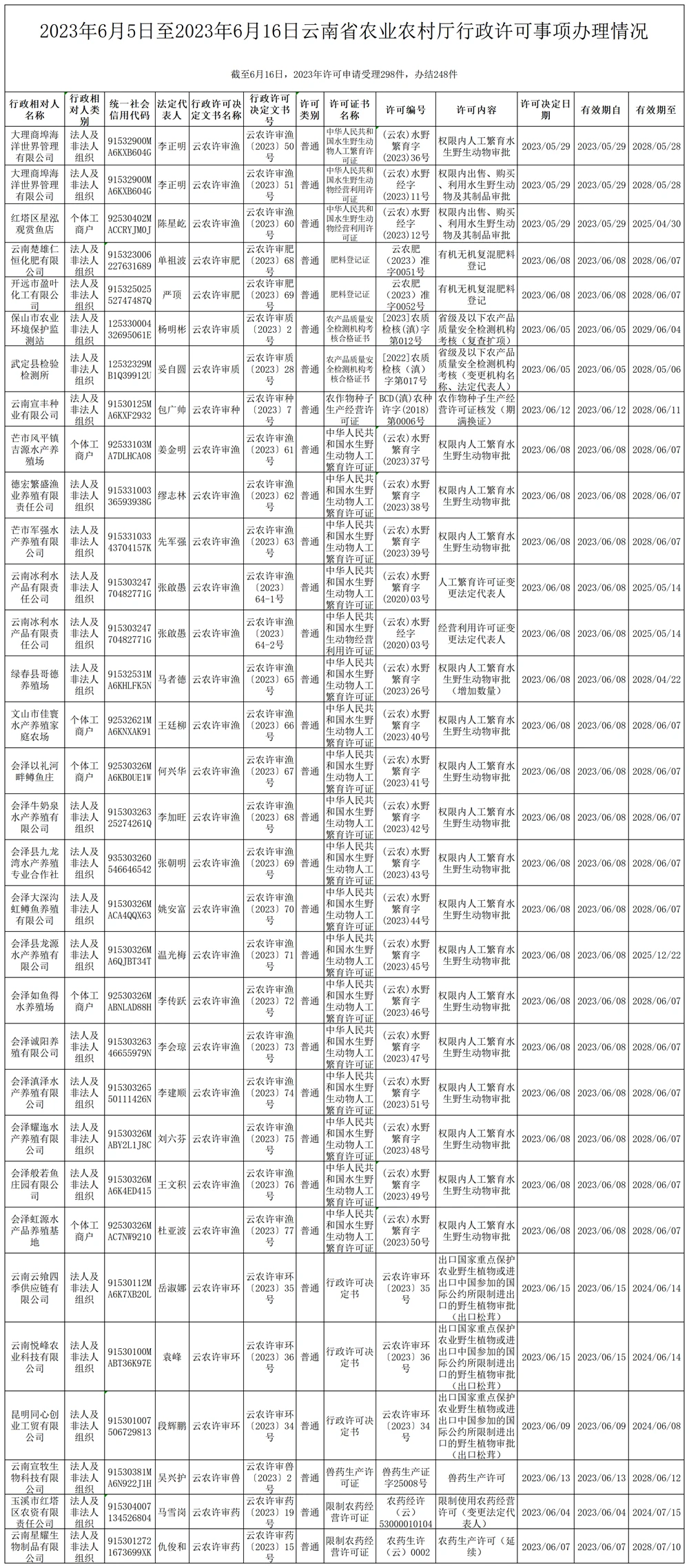 2023年6月5日至2023年6月16日云南省农业农村厅行政许可事项办理情况