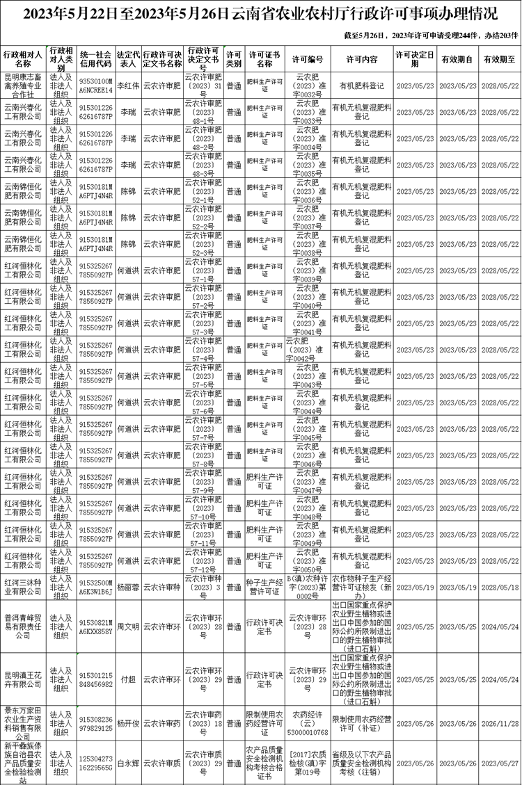 2023年5月22日至2023年5月26日云南省农业农村厅行政许可事项办理情况