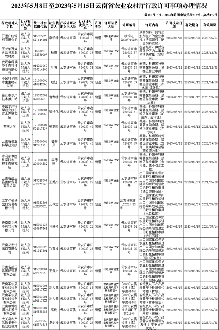 2023年5月8日至2023年5月15日云南省农业农村厅行政许可事项办理情况