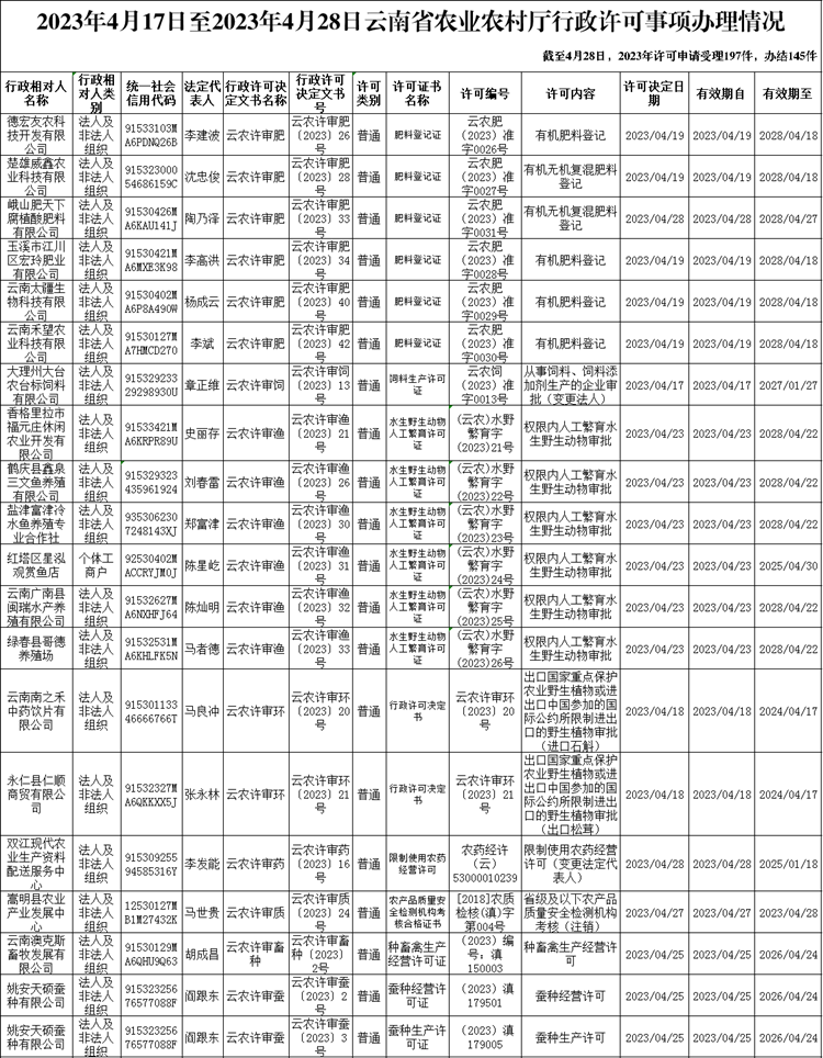 2023年4月17日至2023年4月28日云南省农业农村厅行政许可事项办理情况