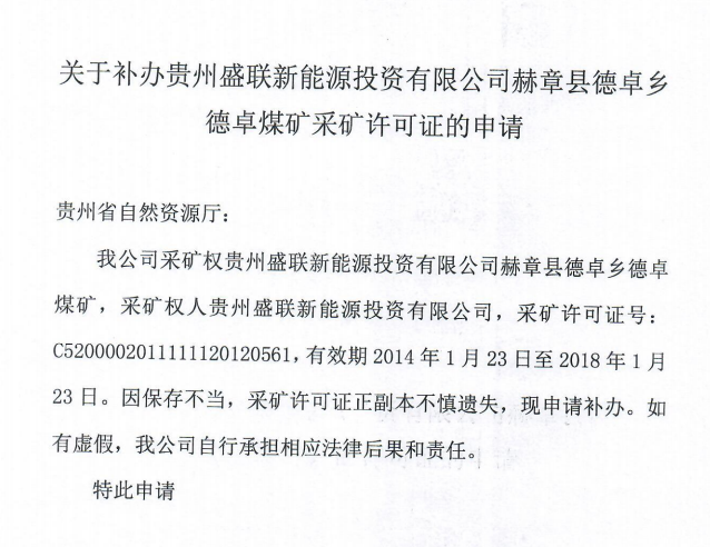 附件:关于补办贵州盛联新能源投资有限公司赫章县德卓乡德卓煤矿采矿许可证的申请