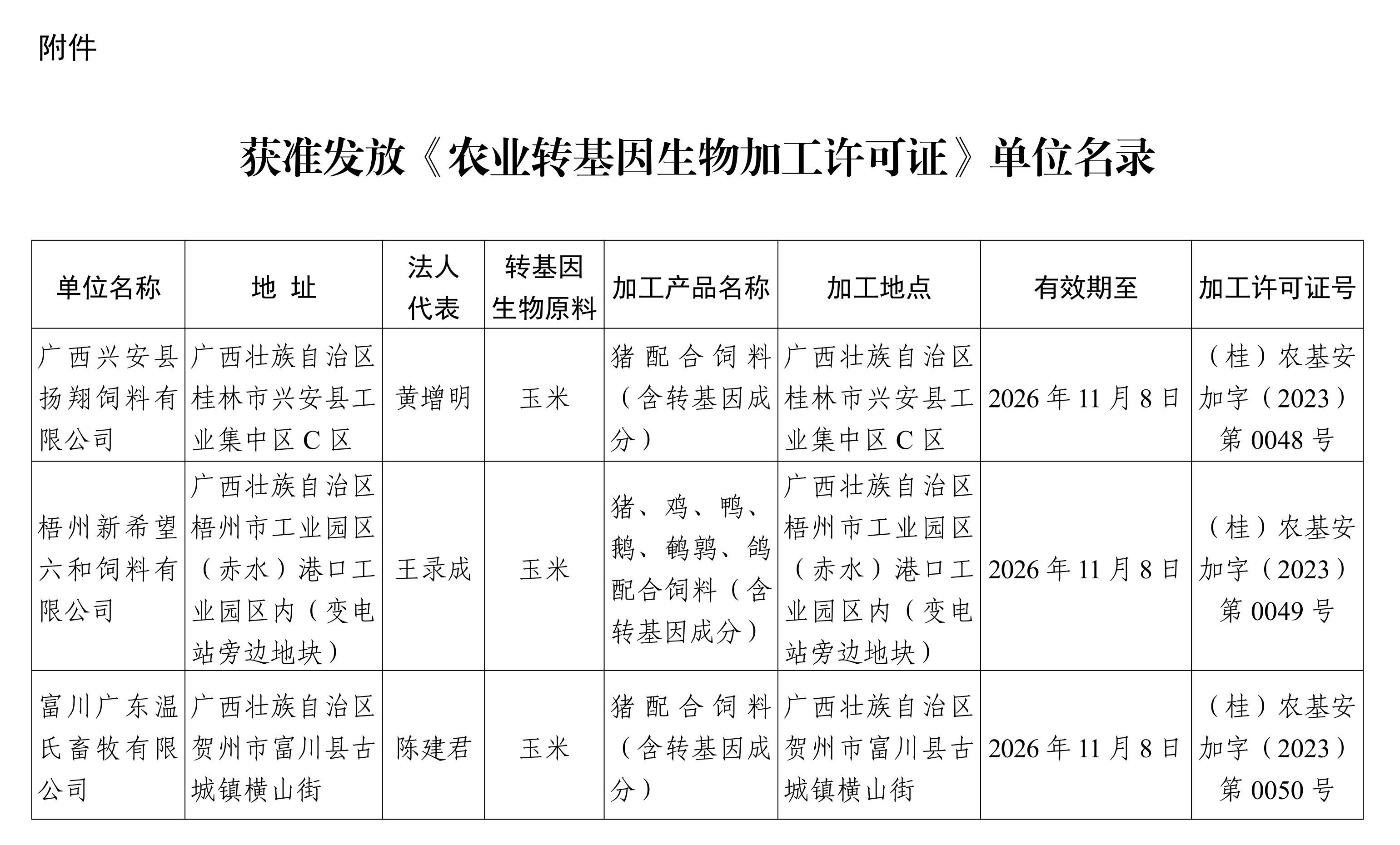 广西兴安县扬翔饲料有限公司、梧州新希望六和饲料有限公司与富川广东温氏畜牧有限公司分别于2023年10月11日、10月11日、10月17日向我厅申请办理《农业转基因生物加工许可证》。依据《农业转基因生物安全管理条例》和《农业转基因生物加工审批办法》的有关规定,我厅对上述企业申请农业转基因生物加工许可的材料进行了审核,并组织专家小组到现场实地考察。根据审核和考察结果,决定发放广西兴安县扬翔饲料有限公司、梧州新希望六和饲料有限公司与富川广东温氏畜牧有限公司《农业转基因生物加工许可证》,现予公告。