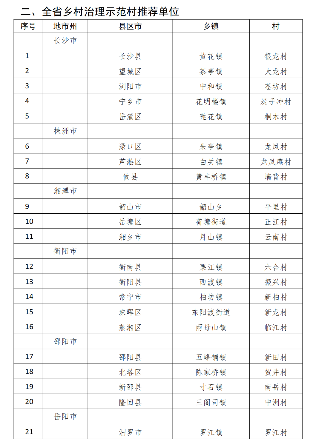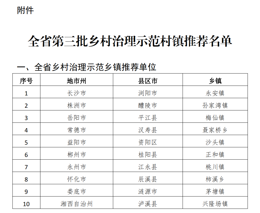 为推进乡村治理体系与治理能力现代化建设,切实发挥典型经验的示范引领作用,根据《湖南省“十四五”农业农村现代化规划》和今年省委一号文件精神以及省委农办、省农业农村厅、省委宣传部、省司法厅、省乡村振兴局《关于开展2023年乡村治理示范村镇创建工作的通知》(湘农联〔2023〕87号)要求,经市县相关部门联合推荐初审,省级相关部门评选,省农业农村厅党组审议,拟推荐浏阳市永安镇等10个乡镇为全省乡村治理示范乡镇,拟推荐长沙县黄花镇银龙村等50个村为全省乡村治理示范村。具体名单见附表。现予公示,公示期2023年12月13日~12月20日。公示期间,如对以上拟推荐村镇有异议,请及时与省农业农村厅农村合作经济指导处联系。